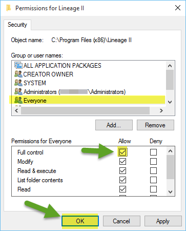 • Make sure Everyone is selected, then tick the box for “Allow” on “Full Control”, then click OK